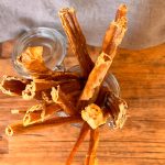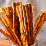 Cooka’s Pork Spaghetti is made from cooked and then air-dried pork intestines. This snack has a slightly elastic texture, making it easy to chew without any risk of large pieces splintering. It can be served whole like a piece of “pasta” or easily cut into smaller treats.